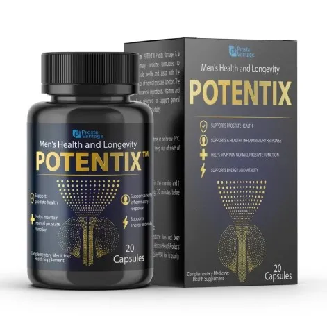 Potentix is a 20-capsule natural complex designed to support prostate comfort and healthy urinary function. The formula combines botanical extracts such as Saw Palmetto, metabolic vitamins, and minerals essential for men’s wellness.